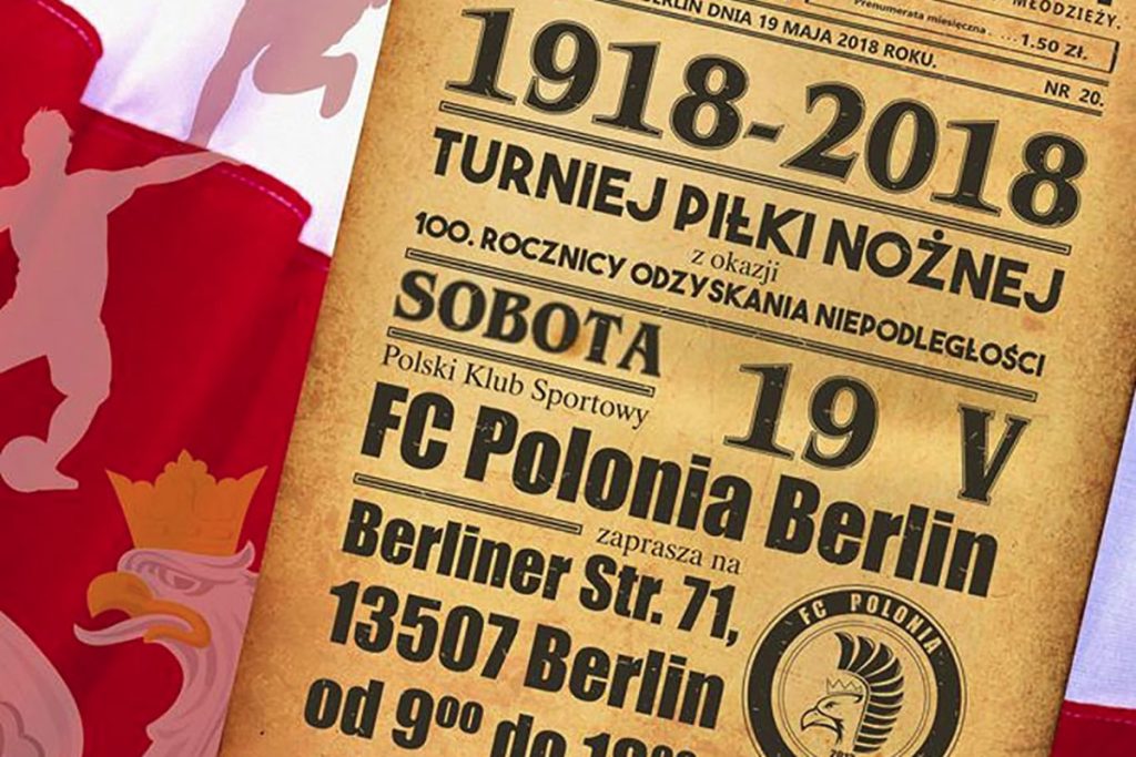 FC Polonia Berlin zaprasza wszystkich Państwa na wyjątkowy turniej piłki nożnej, który odbędzie się 19 maja 2018 roku na dzielnicy Reinickendorf w Berlinie. Jakże mogłoby być inaczej w naszym przypadku: Obchody 100. Rocznicy Odzyskania Niepodległości Rzeczypospolitej Polskiej = zawody sportowe.